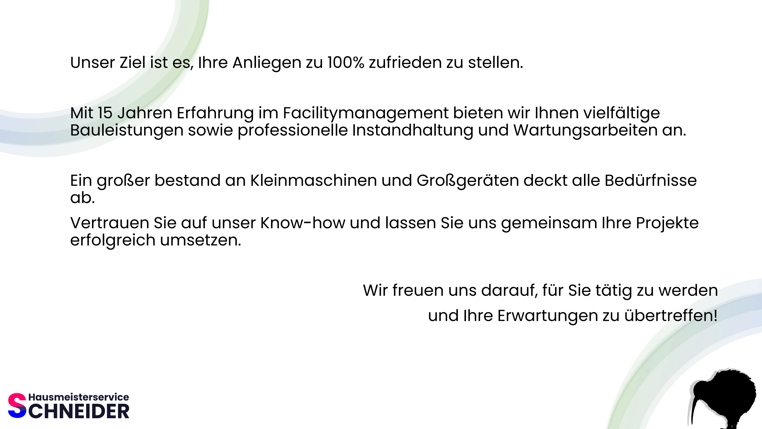 Bei Schneider Dienstleistungen legen wir großen Wert auf eine partnerschaftliche Zusammenarbeit und sind bestrebt, Ihnen den besten günstigen Hausmeisterservice anzubieten.
